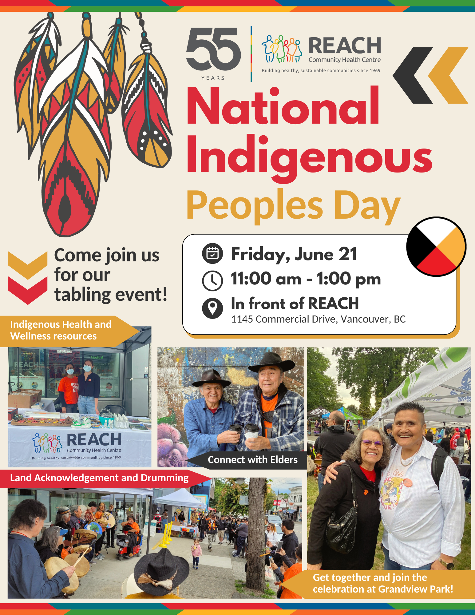 REACH looks forward to welcoming you in celebration of Indigenous People’s Day with us! On June 21 at Grandview Park. You can expect heartful drumming by Indigenous elders, health and wellness resources, Medicine bags, buttons, and more as we honour our Indigenous community and come together in joy and reverance. We hope to see you there, everyone is welcome!