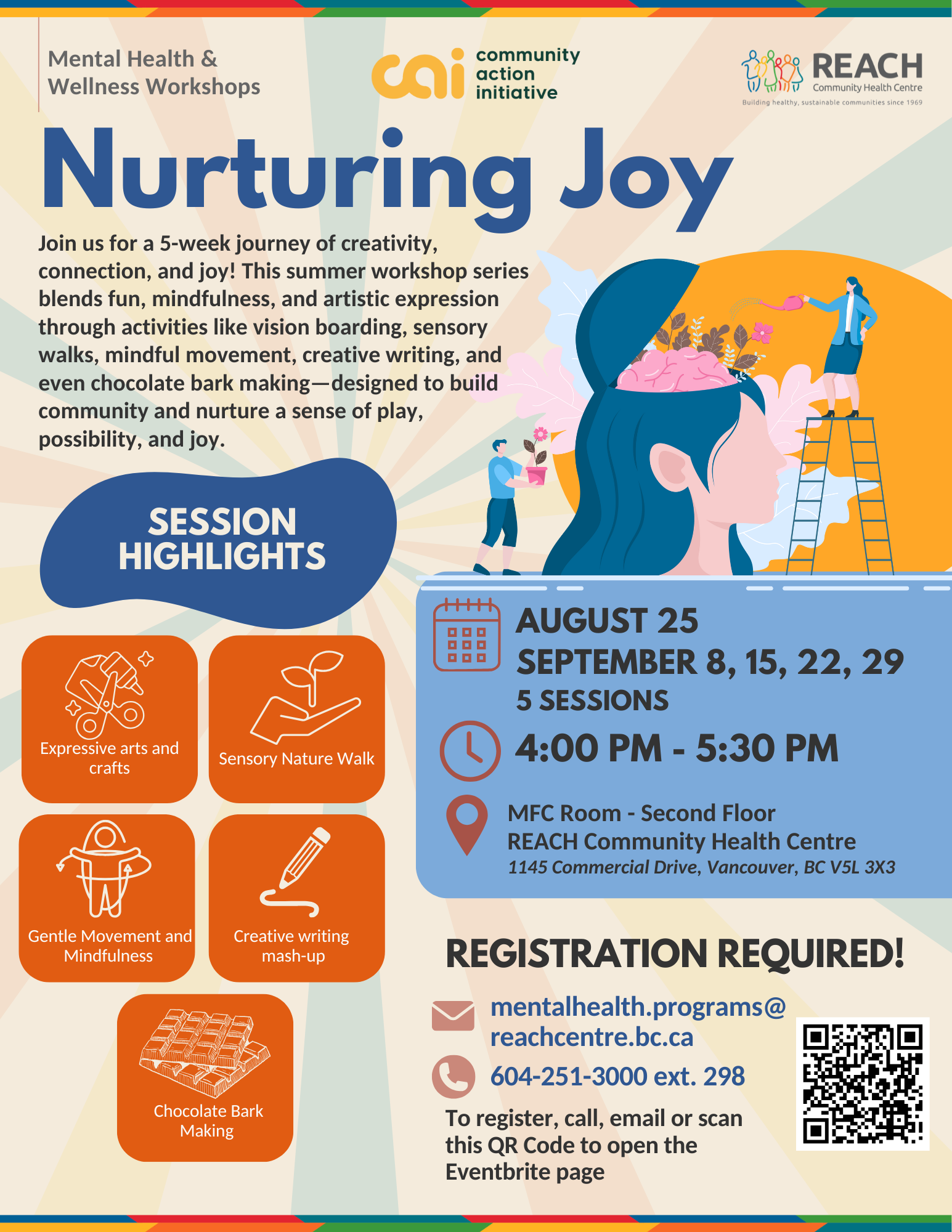 Join us for a 5-week journey of creativity, connection, and joy! This summer workshop series blends fun, mindfulness, and artistic expression through activities like vision boarding, sensory walks, mindful movement, creative writing, and even chocolate bark making—designed to build community and nurture a sense of play, possibility, and joy.
